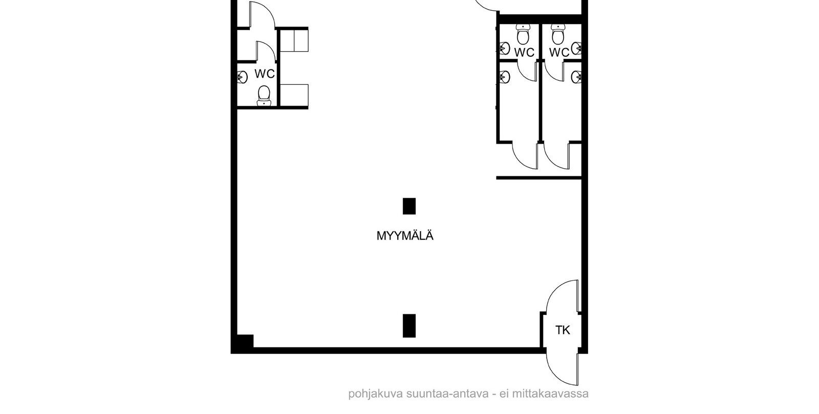 Liiketilassa on kolme wc:tä – esimerkiksi kaksi asiakkaille ja yksi henkilökunnalle – mikä tekee siitä käytännöllisen myös asiakasvirtaiselle toiminnalle.